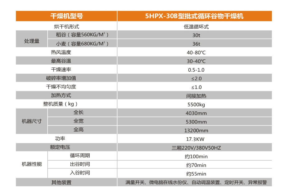 5HPX-30B型低温批式循环谷物干燥机采用了新的设计理念,应用了自动化智能程序,采用电阻式在线检测仪测定谷物水分,高精度传感控制设备,实时智能检测水分,达到设定值后自动停机。扩大了装载容量, 改进了烘干结构, 增加了除尘装置,在烘干速度、破碎率等方面都有了很大的改善,适用于稻谷、小麦、玉米、高粱及各类谷物种子的干燥。
